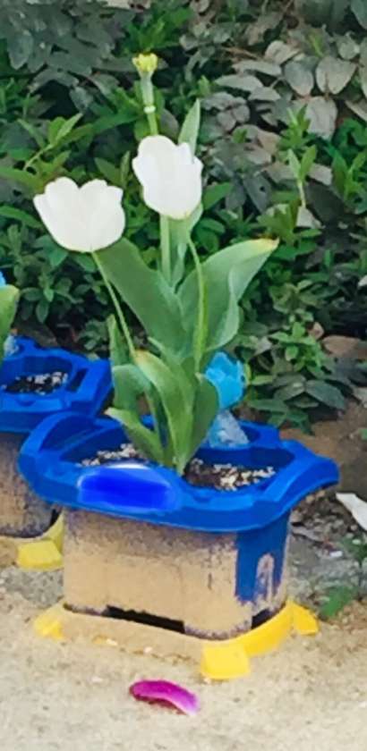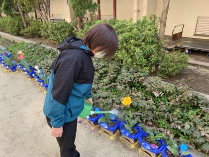 みなさんがそだてていたチューリップがさいています。きれいです。