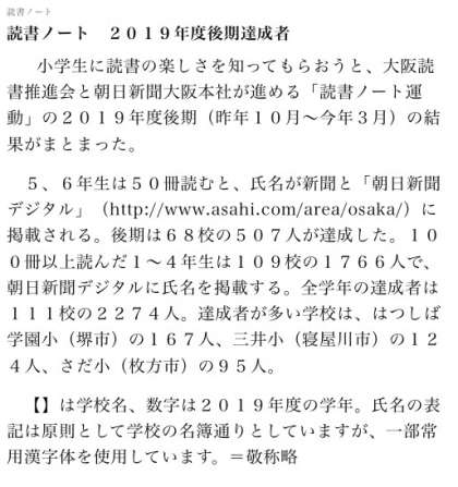 読書ノート2019年度後期達成者の氏名が、本日、朝日新聞デジタルに掲載されました。掲載、おめでとうございます。こちらをご覧ください。→