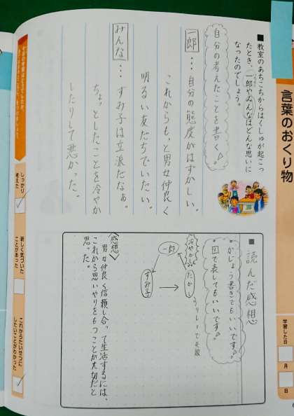 すみ子から一郎への言葉のおくり物を聞いた学級のみんなの思いを考えることから、互いのよさを認め合い、男女が仲良く友情を育てていくことの大切さについての理解を深めることができましたか。