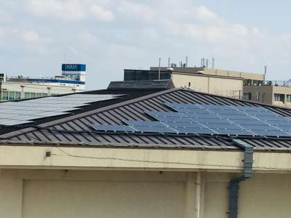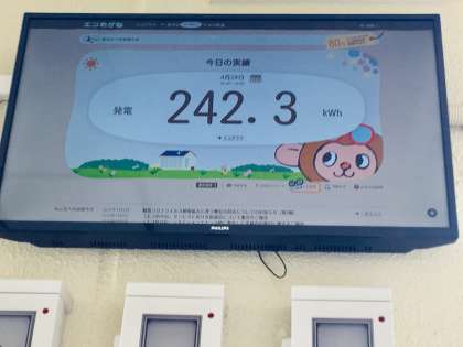 三軒家東小学校の講堂の屋根に、太陽光パネルを設置しています。