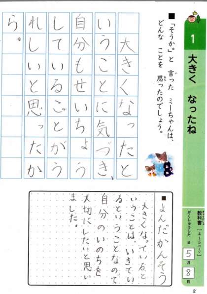 上のだんには、きょうかしょをよんでじぶんのかんがえたことを書きましょう。下のだんには、よんだかんそうなどを書きましょう。