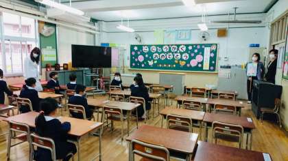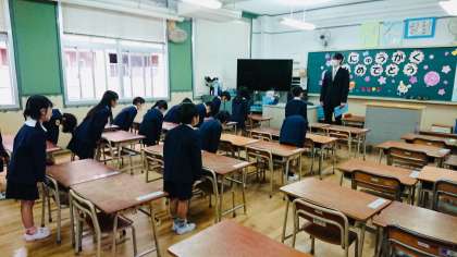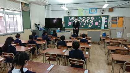 入学にかかるオリエンテーションの様子です。初めて、小学校の教室に入りました。