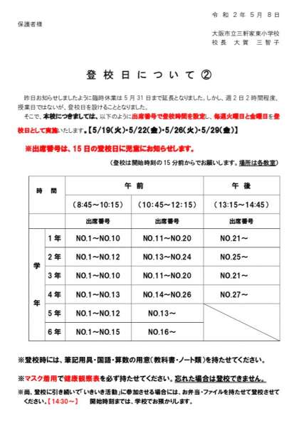 明日、5月19日(火)は登校日です。出席番号での分散登校となっています。(時間の変更はできませんので、ご了承ください。)