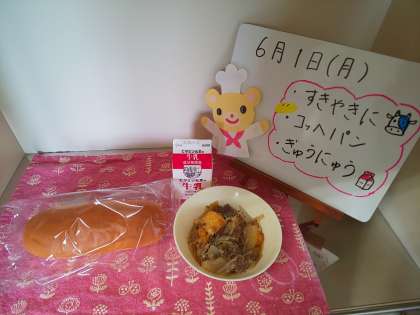 今日の給食は、すき焼き煮、コッペパン、牛乳です。