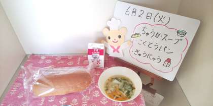 今日の給食は、中華スープ、黒糖パン、牛乳です。