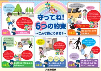 「まもってね 5つのやくそく」の どうが は、こちらです。→ https://www.police.pref.osaka.lg.jp/seikatsu/kodomo_jyosei/3/7016.html
