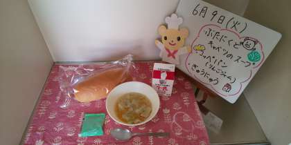 今日の給食は、豚肉とキャベツのスープ、コッペパン(りんごジャム)、牛乳です。