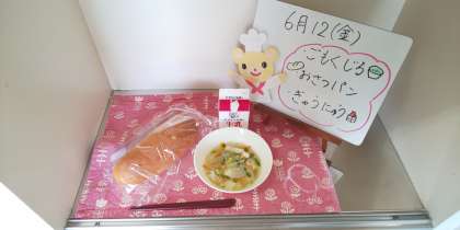 今日の給食は、五目汁、おさつパン、牛乳です。