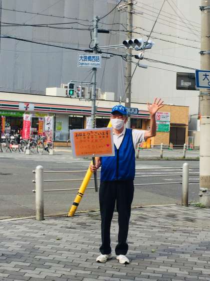見守り隊の方が、児童の登校時に見守りをしてくださっています。プラカードは、見守り隊の方が手作りをしてくださったものです。