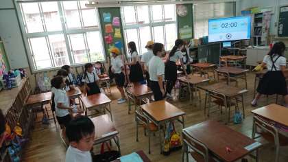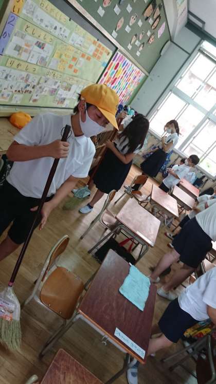 6年生が1年生に、そうじの仕方をやさしく教えていました。