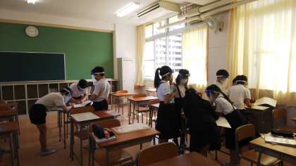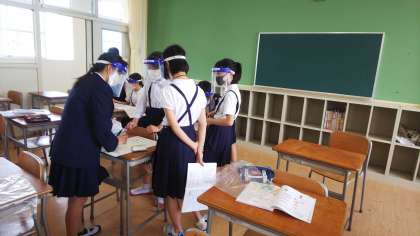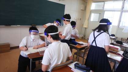 算数のグループ学習で、フェイスシールドを使いました。与えられた問題から考えられる結果について、グループで話し合いました。