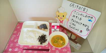 今日の給食は、さごしの塩焼き、みそ汁、牛ひじきそぼろ、ご飯、牛乳です。