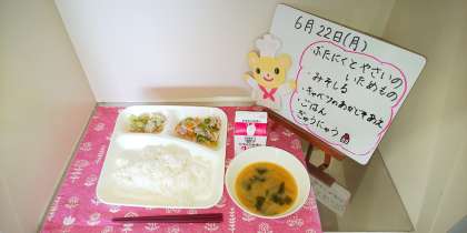 今日の給食は、豚肉と野菜のいためもの、みそ汁、キャベツの赤じそあえ、ごはん、牛乳です。