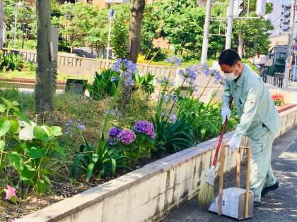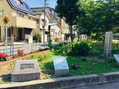 三軒家公園は、「近代紡績工業発祥の地(きんだい ぼうせき こうぎょう はっしょうのち)」です。たくさんの花がさいていて、きれいです。アジサイもさいています。