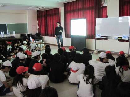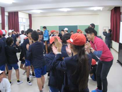 ゲストティーチャーは、ヴィッセル神戸であこがれの三浦知良選手と一緒にプレーするという夢をかなえた元Jリーガーの仲里航さんでした。あいにくの天気のため、サッカーはお話だけとなりましたが、「夢を叶える5つの法則」というお話にみんなとても集中して聞いていました。