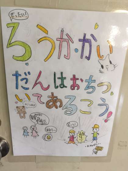 【ポスター】児童からの よびかけ 「ぜったい ろうか・かいだんは おちついて あるこう」