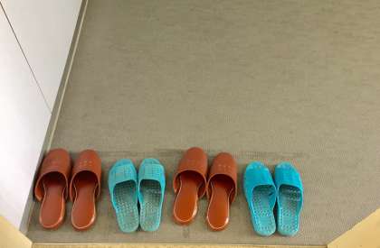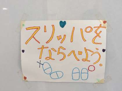 つぎにトイレをつかう人のことを考えて、スリッパをならべましょう。