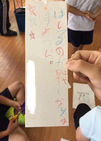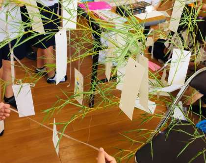 本校には、特別支援学級は7クラスあります。一同に集まり、なかよし集会で七夕のかざりづくりをしました。35名の