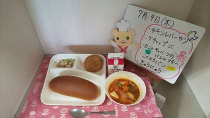 今日の給食は、チキンレバーカツ、ケチャップ煮、たことキャベツのバジルソテー、こくとうパン、牛乳です。