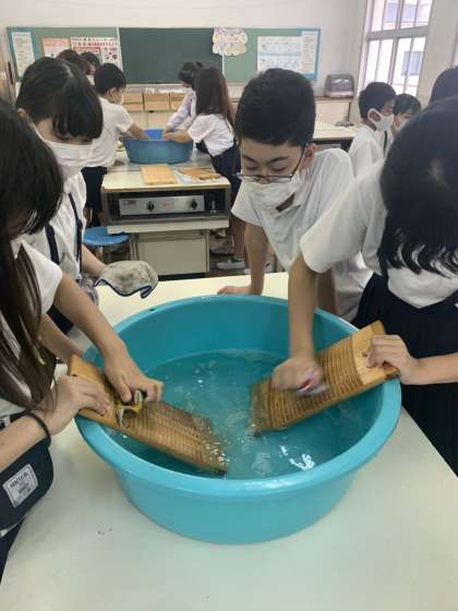 洗濯板とおけを使い、手洗いを実習しました。小さなハンカチを一生懸命ゴシゴシと洗いました。疲れたと話す児童もいました。手洗いはとっても力が必要だと気づいたようで