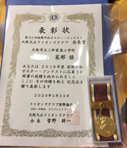 第32回 国際平和ポスター・コンテストで、大阪大正ライオンズクラブ 会長賞をいただいた児童が、校長先生から表彰されました。