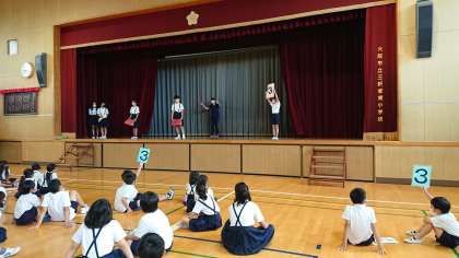 質問に答えている声を聞いて、誰先生なのかを当てるクイズです。先生も、声を変えて答えているので少し難しかったですが、みんな一生懸命聞いて、考えていました。
