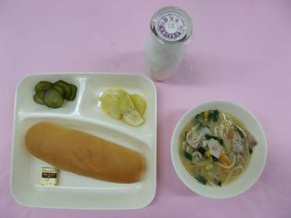 今日の献立は「みそラーメン、焼きさつまいもの甘みつかけ、きゅうりの辛みづけ」でした。