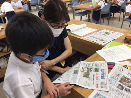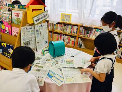 新聞を活用した学習をしています。今年度、毎日小学生新聞を読む毎日寄贈(きぞう)していただいています。学校図書館補助員さんから教えていただいています。