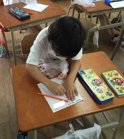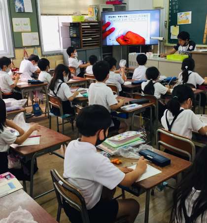 収穫をした後、記録をしました。こどもたちがわかりやすいように、書画カメラを活用して指導をしています。