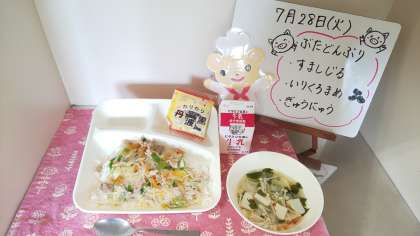 今日の給食は、豚丼、すまし汁、いり黒豆、牛乳です。