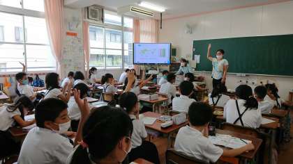 3・4年生はまみ先生と、5年生はジョン先生とともに、楽しく学習しいています。