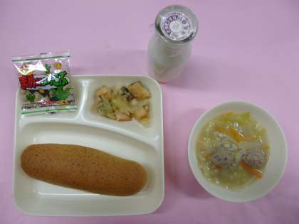 今日の献立は「さけのマリネ、肉団子と麦のスープ、豆こんぶ」でした。
