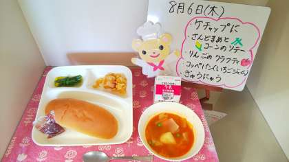 今日の給食は、ケチャップ煮、さんどまめとコーンのソテー、りんごのクラフティ、コッペパン、いちごジャム、牛乳です。