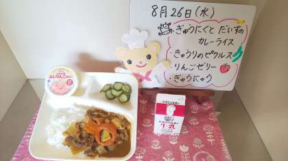 今日の給食は、牛肉と大豆のカレーライス【米粉】、きゅうりのピクルス、りんごゼリー、牛乳です。