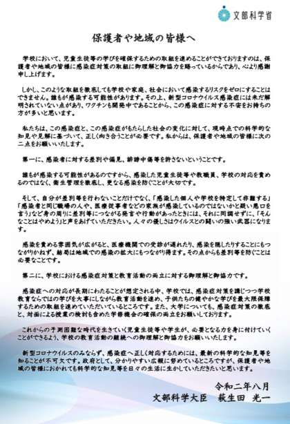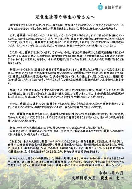 文部科学省より以下の通り、文部科学大臣からのメッセージが発表されております。
