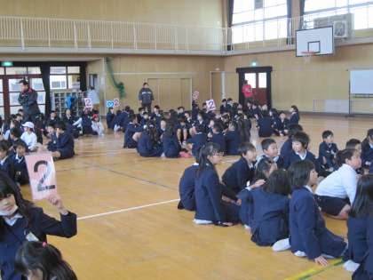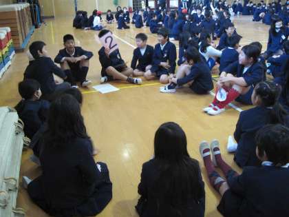 三つの答えの中からグループで相談して答えを選び、リーダーが番号札をあげます。みんな、真剣に考え、楽しく活動できました。