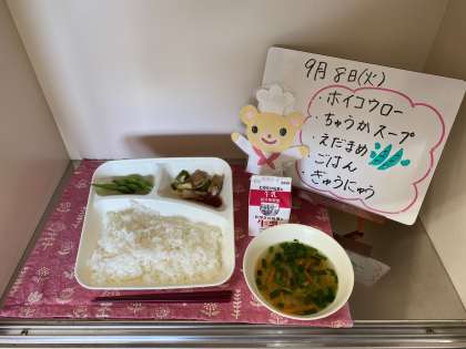 今日の給食は、ホイコウロー、中華スープ、えだまめ、ごはん、牛乳です。