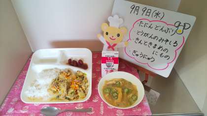 今日の給食は、他人丼、とうがんのみそ汁、金時豆の煮もの、牛乳です。