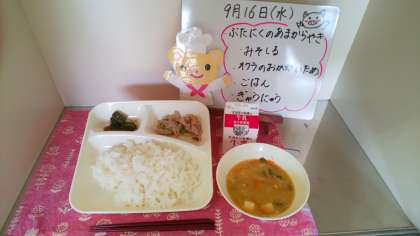 今日の給食は、豚肉の甘辛焼き、みそ汁、オクラのおかかいため、ごはん、牛乳です。