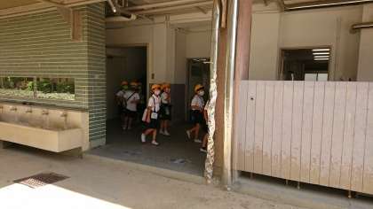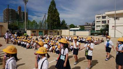火災を想定しての避難訓練を実施しました。マスクの上から、ハンカチで鼻と口をおさえ、できるだけ煙を吸わないように避難しています。