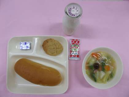 今日の献立は、「とうふハンバーグ、じゃがいもとキャベツのスープ煮、固形チーズ」でした。