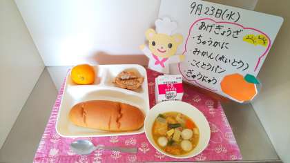 今日の給食は、あげぎょうざ、中華煮、みかん(冷凍)、黒糖パン、牛乳です。