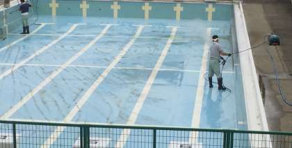 来年に向けて、管理作業員さんがプール清掃をしてくださいました。