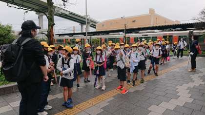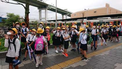 今日は、2グループに別れて、4年生が、舞洲工場の見学に来ています。後半グループ、桜島駅に着き、バスを待っています。雨は、あがっています。
