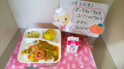 今日の給食は、ポークカレーライス【米粉】、はくさいのピクルス、みかん、牛乳です。