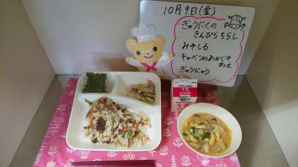今日の給食は、牛肉のきんぴらちらし、みそ汁、キャベツの赤じそあえ、牛乳です。