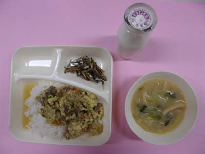 今日の献立は「他人丼、みそ汁、ごまめ」でした。