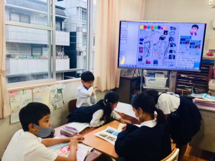 「わたしたちの大阪」の防災マップ作りのページを大型テレビにうつしています。