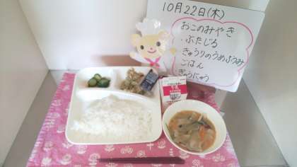 今日の給食は、お好み焼き、豚汁、きゅうりの梅風味、ごはん、牛乳です。