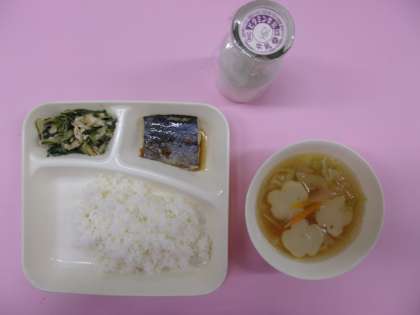 今日の献立は「さごしのしょうゆだれかけ、すまし汁、みずなの煮びたし」でした。